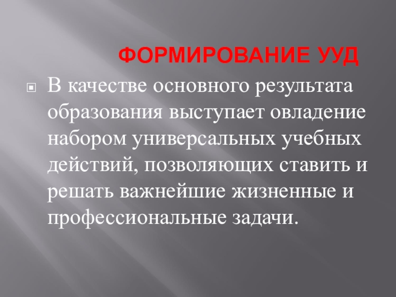 ФОРМИРОВАНИЕ УУДВ качестве основного результата образования выступает овладение набором универсальных учебных действий,
