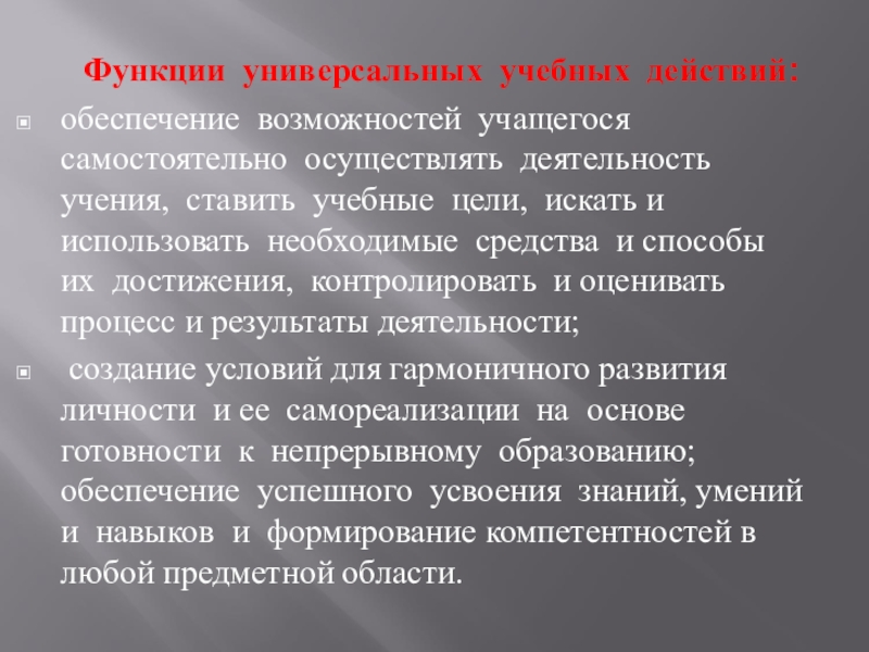 Функции универсальных учебных действий:обеспечение возможностей учащегося самостоятельно осуществлять деятельность учения, ставить учебные цели, искать и использовать