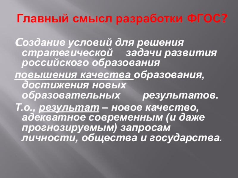 Главный смысл разработки ФГОС? Cоздание условий для решения стратегической задачи развития российского образованияповышения качества образования, достижения новых