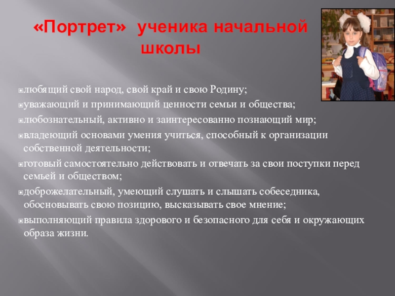 «Портрет» ученика начальной школылюбящий свой народ, свой край и свою Родину;уважающий и принимающий ценности семьи и общества;любознательный,