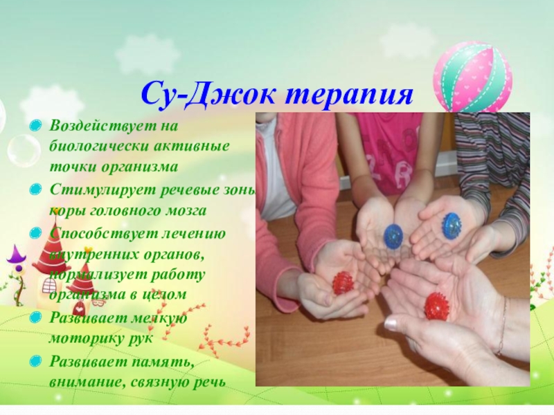 Су-Джок терапияВоздействует на биологически активные точки организмаСтимулирует речевые зоны коры головного мозгаСпособствует лечению внутренних органов, нормализует работу