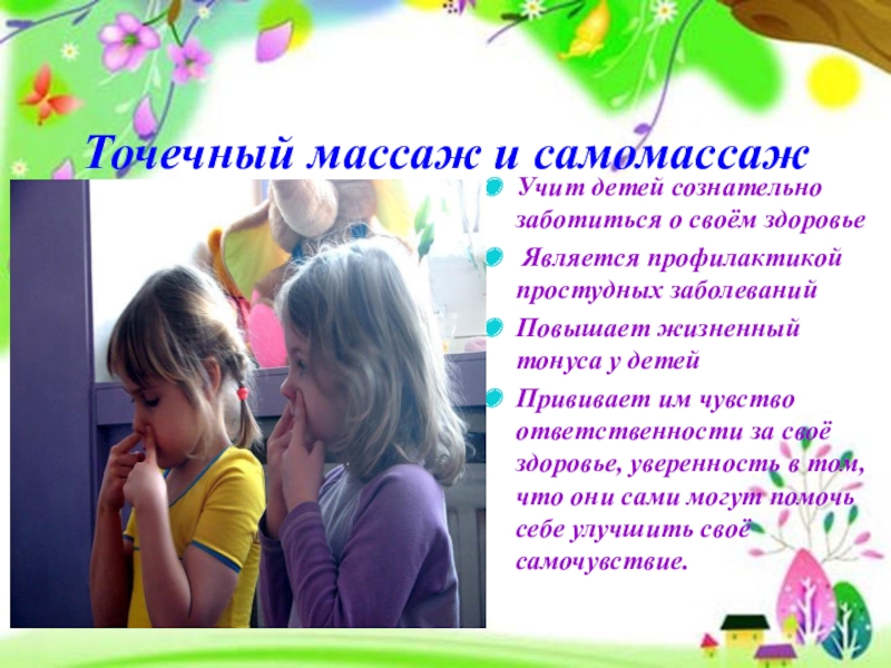 Точечный массаж и самомассажУчит детей сознательно заботиться о своём здоровье Является профилактикой простудных заболеванийПовышает жизненный тонуса у