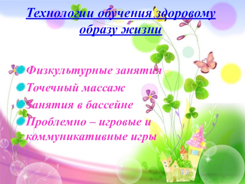Технологии обучения здоровому образу жизни Физкультурные занятияТочечный массажЗанятия в бассейнеПроблемно – игровые и коммуникативные игры