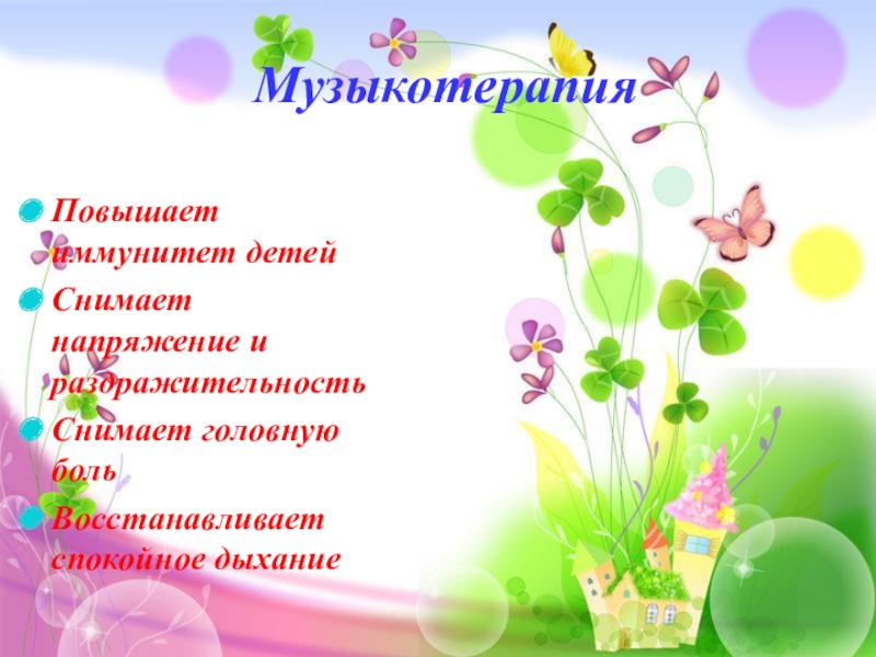 МузыкотерапияПовышает иммунитет детейСнимает напряжение и раздражительностьСнимает головную больВосстанавливает спокойное дыхание