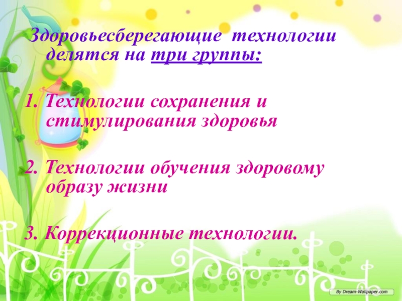 Здоровьесберегающие технологии делятся на три группы:1. Технологии сохранения и стимулирования здоровья2. Технологии обучения здоровому образу жизни3.