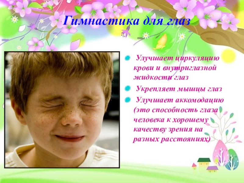 Гимнастика для глаз Улучшает циркуляцию крови и внутриглазной жидкости глаз Укрепляет мышцы глаз Улучшает аккомодацию (это