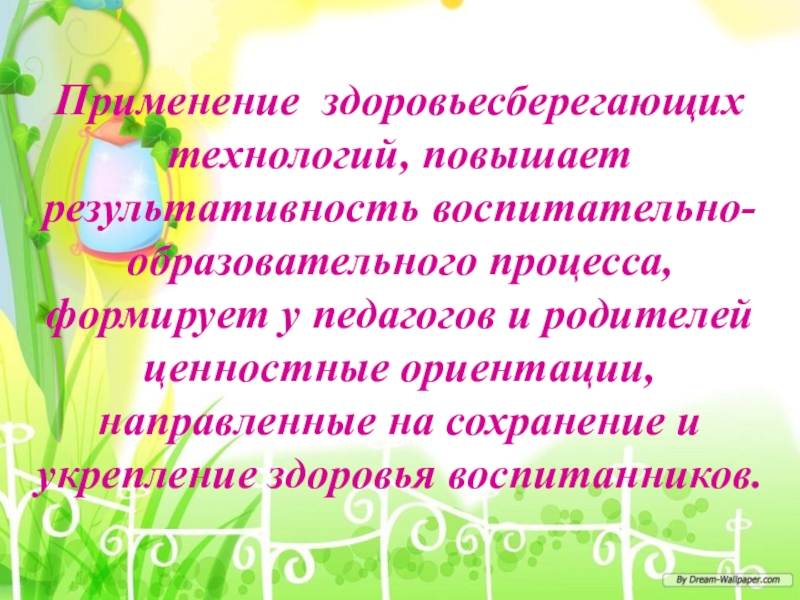 Применение здоровьесберегающих технологий, повышает результативность воспитательно-образовательного процесса, формирует у педагогов и родителей ценностные ориентации, направленные на сохранение
