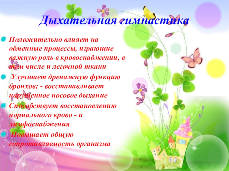 Дыхательная гимнастика  Положительно влияет на обменные процессы, играющие важную роль в кровоснабжении, в том числе и
