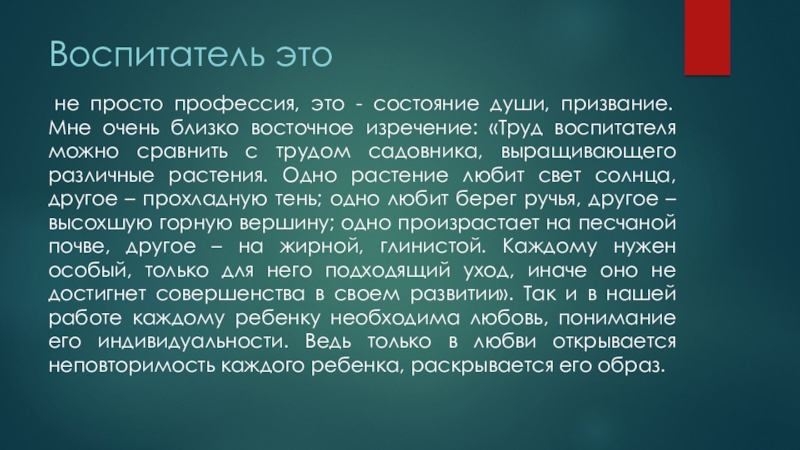очень близко восточное изречение: «Труд воспитателя можно сравнить с трудом садовника, выращивающего различные растения. Одно растение любит свет солнца, другое – прохладную тень; одно любит берег ручья, другое – высохшую горную вершину; одно произрастает на песчаной почве, другое – на жирной, глинистой. Каждому нужен особый, только для него подходящий уход, иначе оно не достигнет совершенства в своем развитии». Так и в нашей работе каждому ребенку необходима любовь, понимание его индивидуальности. Ведь только в любви открывается неповторимость каждого ребенка, раскрывается его образ.