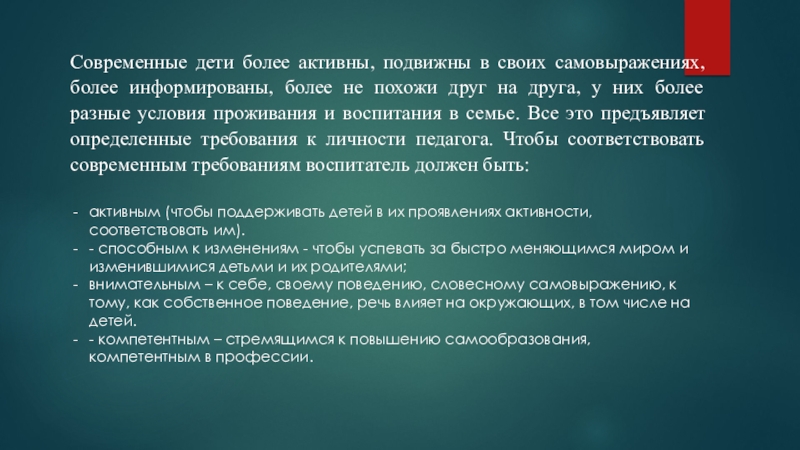не похожи друг на друга, у них более разные условия проживания и воспитания в семье. Все это предъявляет определенные требования к личности педагога. Чтобы соответствовать современным требованиям воспитатель должен быть:
