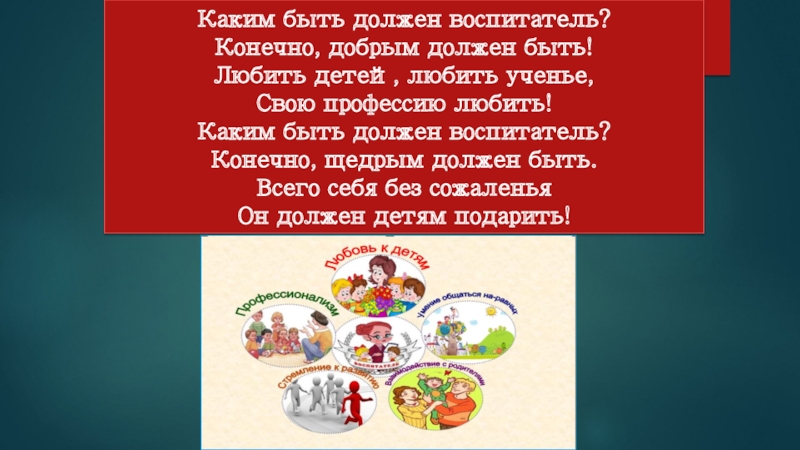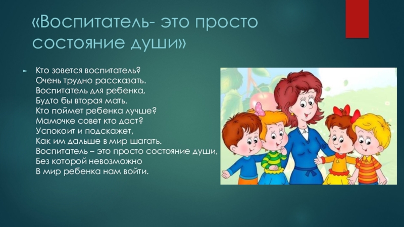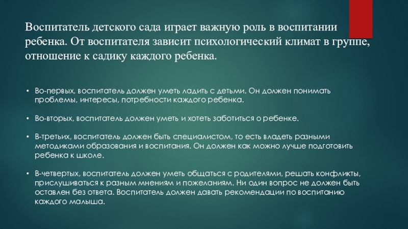 Слайд 9Воспитатель детского сада играет важную роль в воспитании ребенка. От воспитателя