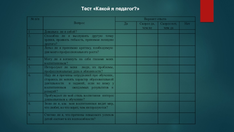 работаете согласно этим требованиям: уверены в себе, готовы к изменениям, работе над собой, видите затруднения детей, интересуетесь личностью каждого ребёнка, а не прохождением программы, стремитесь сделать процесс воспитания и обучения интересным для воспитанников.