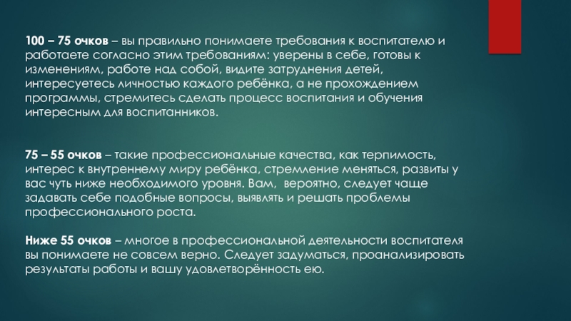 100 – 75 очков – вы правильно понимаете требования к воспитателю и