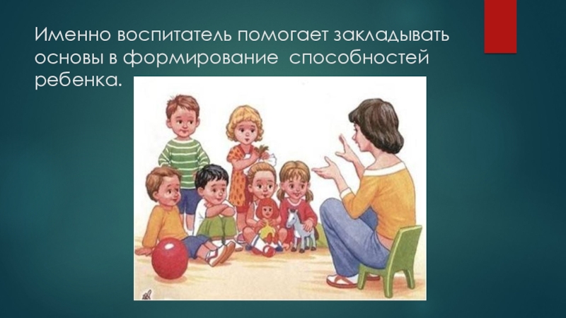 Слайд 11Именно воспитатель помогает закладывать основы в формирование способностей ребенка.