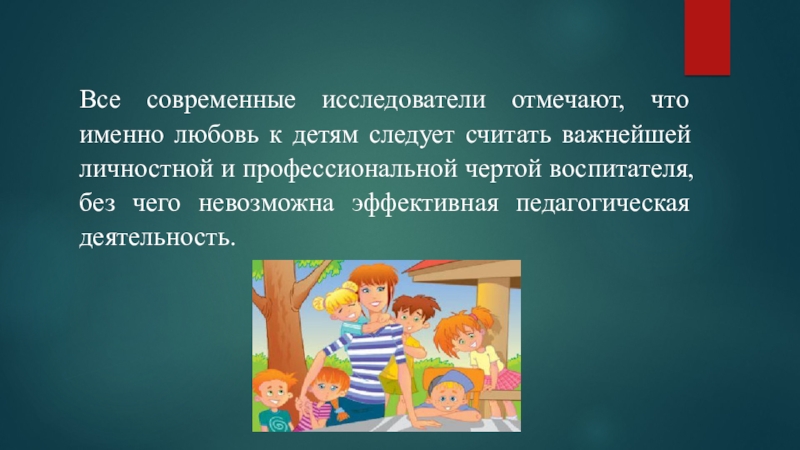 Слайд 7Все современные исследователи отмечают, что именно любовь к детям следует считать