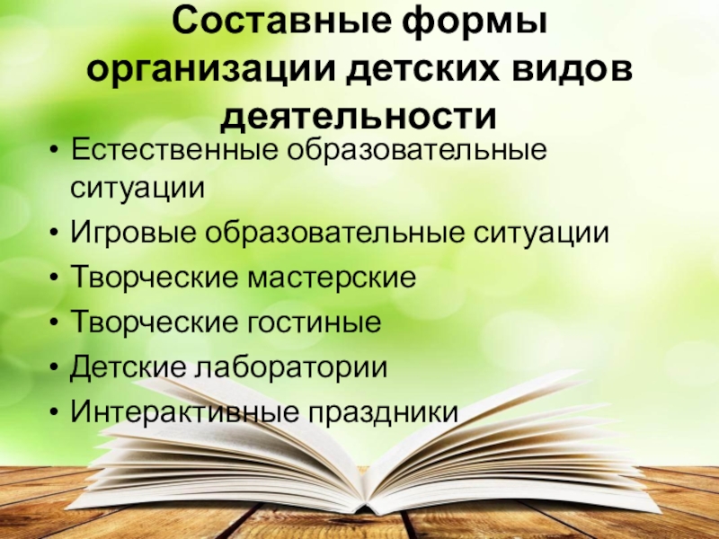 игровые (игра-занятие) образовательные ситуации, творческие мастерские и гостиные, детские лаборатории, интерактивные праздники)