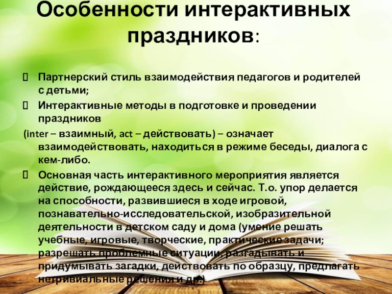 Основная часть интерактивного мероприятия является действие, рождающееся здесь и сейчас. Т.о. упор делается на способности, развившиеся в ходе игровой, познавательно-исследовательской, изобразительной деятельности в детском саду и дома (умение решать учебные, игровые, творческие, практические задачи; разрешать проблемные ситуации, разгадывать и придумывать загадки, действовать по образцу, предлагать нетривиальные решения и др.)
