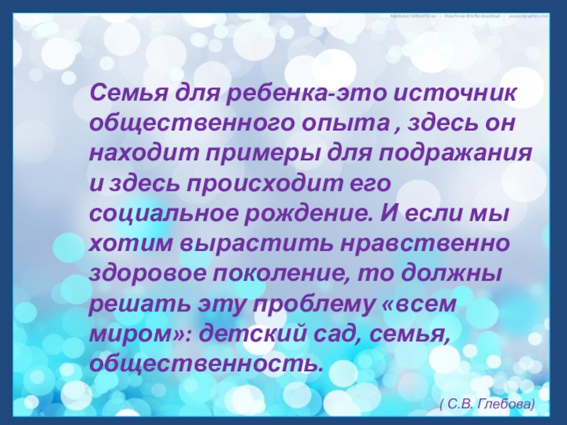 Слайд 2Семья для ребенка-это источник общественного опыта , здесь он находит примеры
