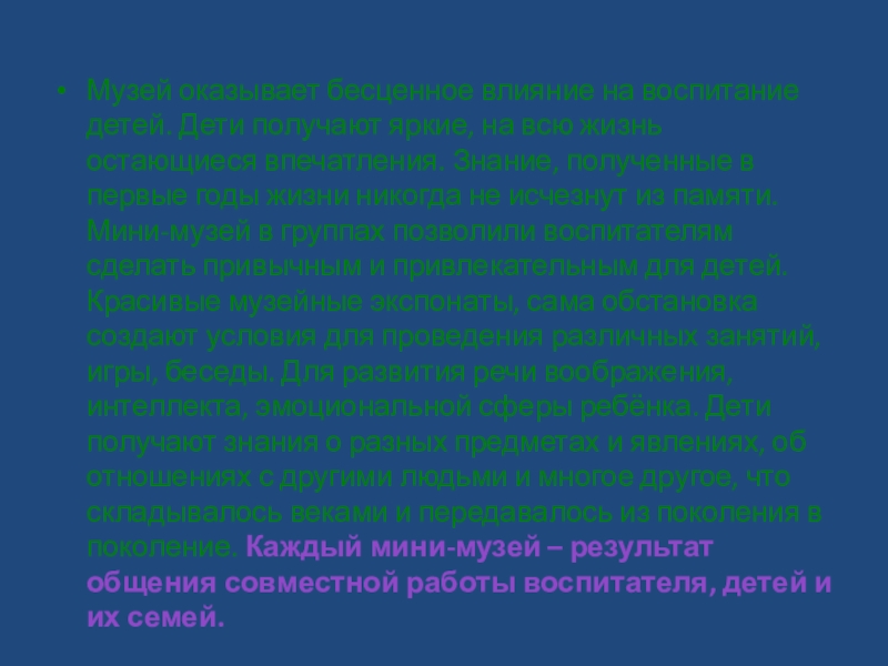 всю жизнь остающиеся впечатления. Знание, полученные в первые годы жизни никогда не исчезнут из памяти. Мини-музей в группах позволили воспитателям сделать привычным и привлекательным для детей. Красивые музейные экспонаты, сама обстановка создают условия для проведения различных занятий, игры, беседы. Для развития речи воображения, интеллекта, эмоциональной сферы ребёнка. Дети получают знания о разных предметах и явлениях, об отношениях с другими людьми и многое другое, что складывалось веками и передавалось из поколения в поколение. Каждый мини-музей – результат общения совместной работы воспитателя, детей и их семей.