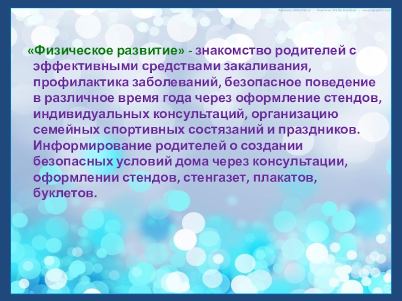 Слайд 7 «Физическое развитие» - знакомство родителей с эффективными средствами закаливания,