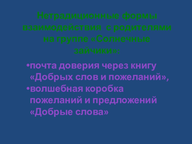 Слайд 9Нетрадиционные формы взаимодействия с родителями на группе «Солнечные зайчики»:
