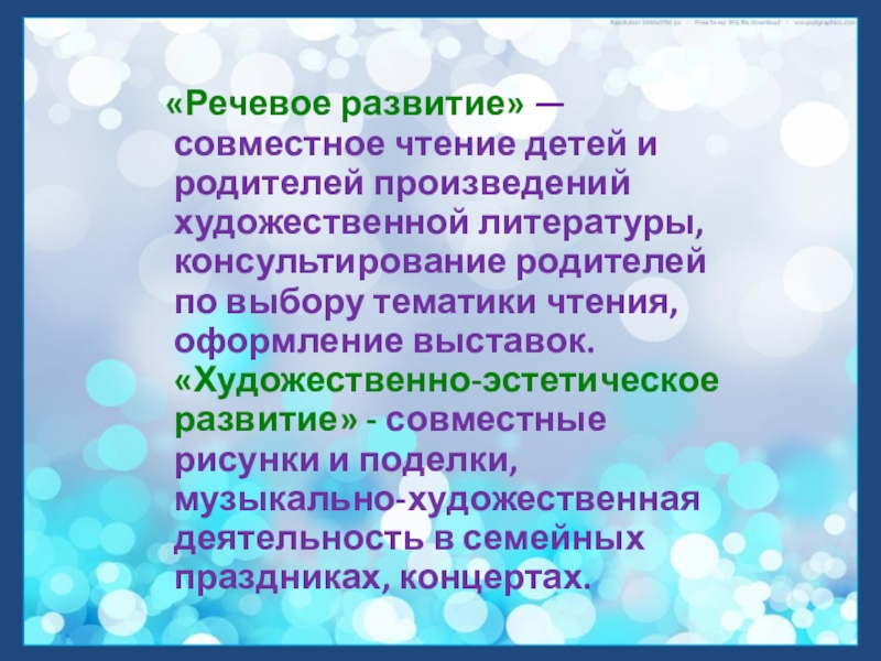 «Художественно-эстетическое развитие» - совместные рисунки и поделки, музыкально-художественная деятельность в семейных праздниках, концертах.