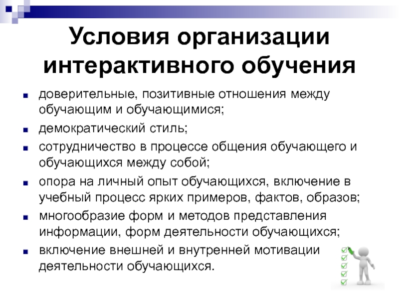 доверительные, позитивные отношения между обучающим и обучающимися;