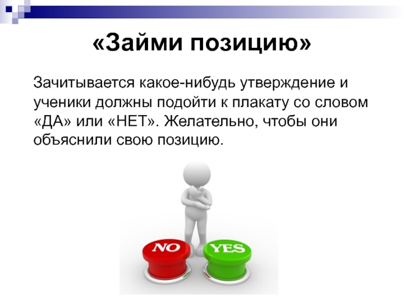 к плакату со словом «ДА» или «НЕТ». Желательно, чтобы они объяснили свою позицию.