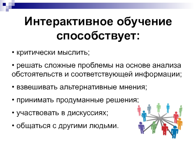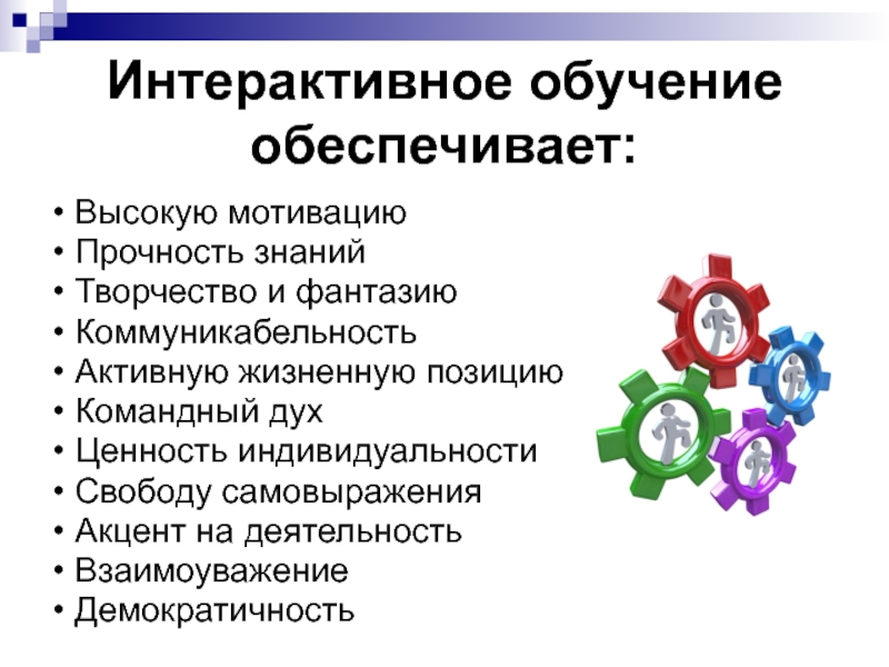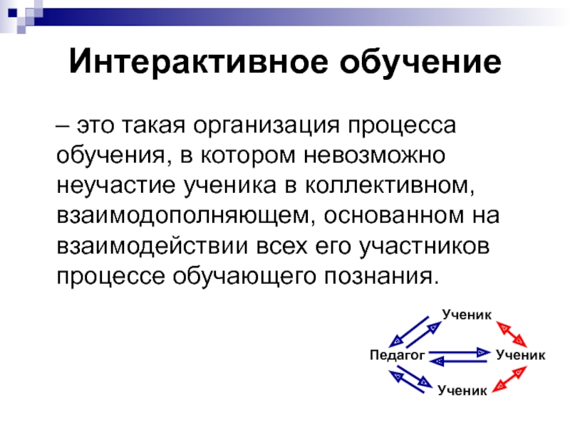 Интерактивная – inter (взаимный), act (действовать). Ученик и учитель являются равноправными субъектами обучения.