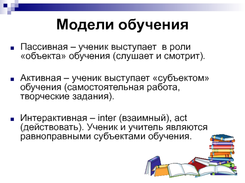 Пассивная – ученик выступает в роли «объекта» обучения (слушает и