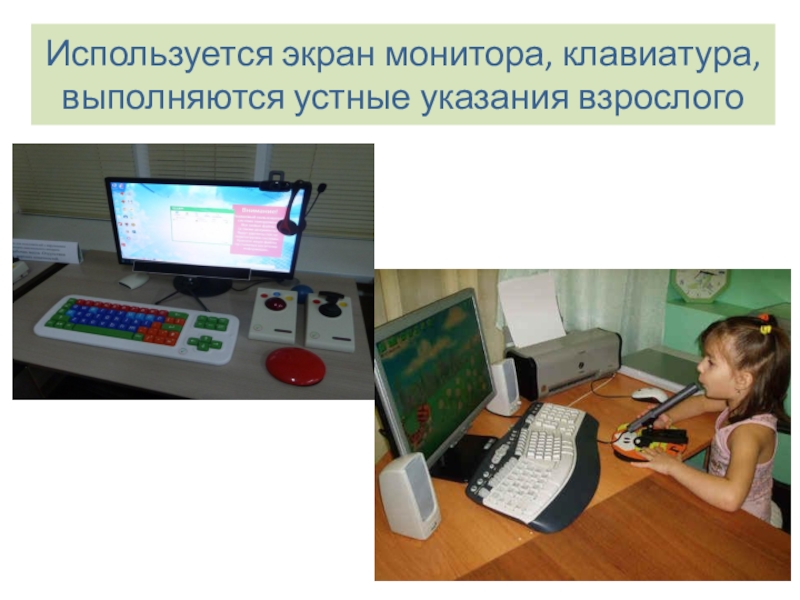 Слайд 9Используется экран монитора, клавиатура, выполняются устные указания взрослого