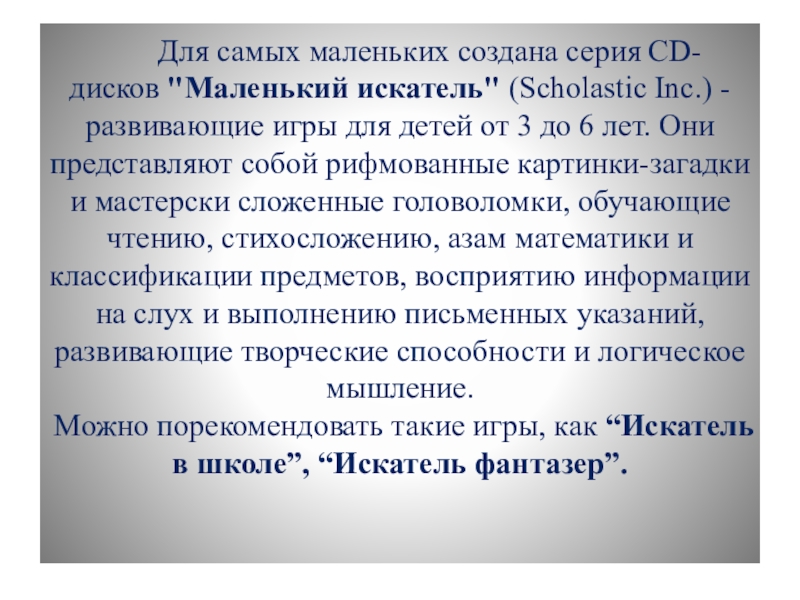 CD-дисков "Маленький искатель" (Scholastic Inc.) - развивающие игры для детей от 3 до 6 лет. Они представляют собой рифмованные картинки-загадки и мастерски сложенные головоломки, обучающие чтению, стихосложению, азам математики и классификации предметов, восприятию информации на слух и выполнению письменных указаний, развивающие творческие способности и логическое мышление.