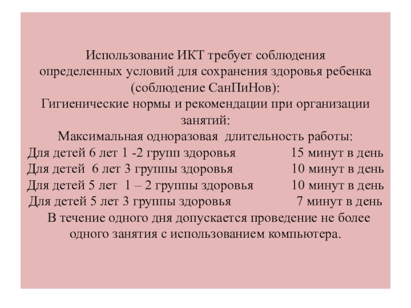 Слайд 25Использование ИКТ требует соблюдения определенных условий для сохранения здоровья ребенка (соблюдение СанПиНов):