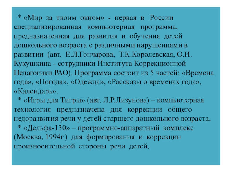специализированная компьютерная программа, предназначенная для развития и обучения детей дошкольного возраста с различными нарушениями в развитии (авт. Е.Л.Гончарова, Т.К.Королевская, О.И.Кукушкина - сотрудники Института Коррекционной Педагогики РАО). Программа состоит из 5 частей: «Времена года», «Погода», «Одежда», «Рассказы о временах года», «Календарь».
