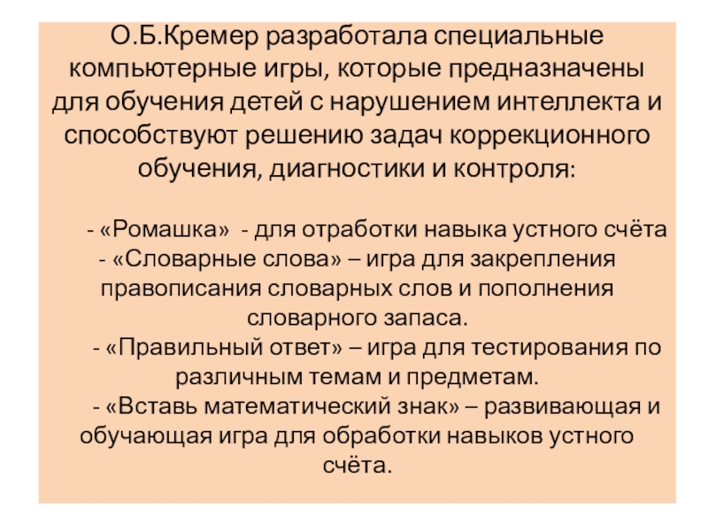 Слайд 18О.Б.Кремер разработала специальные компьютерные игры, которые предназначены для обучения детей с