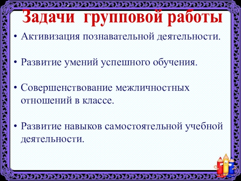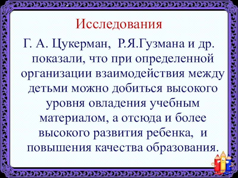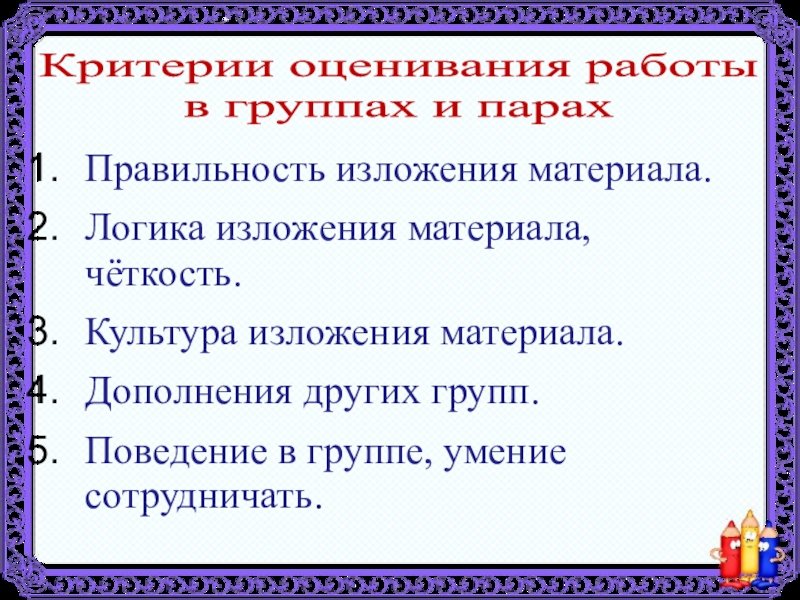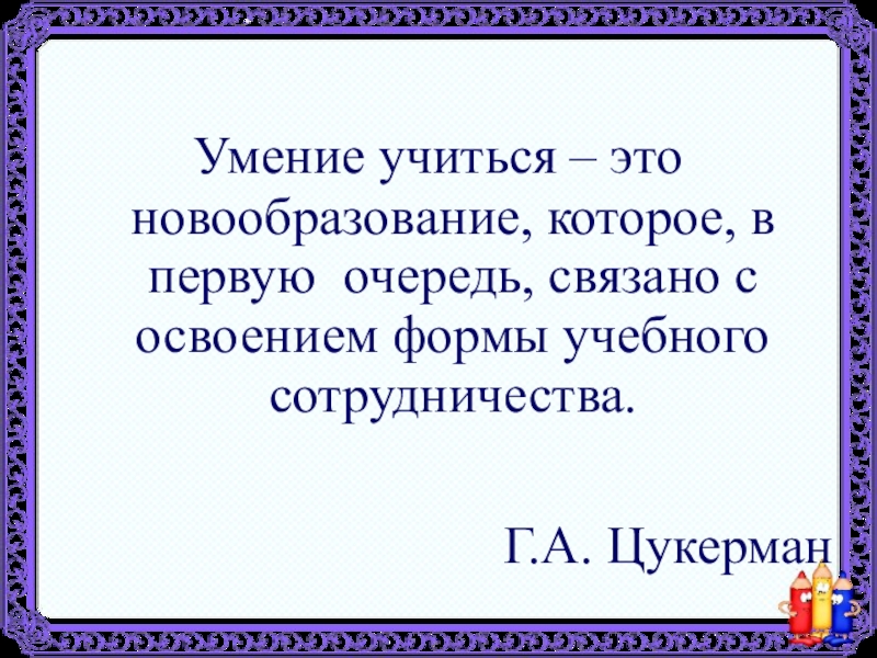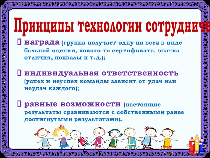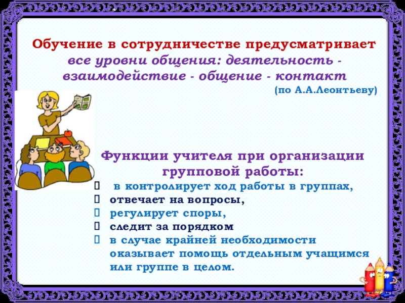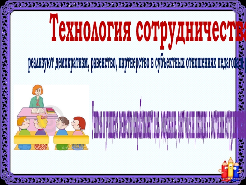 Учитель и учащиеся совместно вырабатывают цель, содержание, дают оценки, находясь в состоянии сотрудничества, сотворчества.