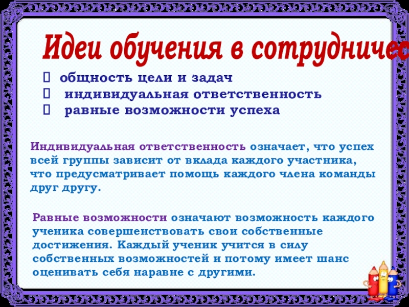 Индивидуальная ответственность означает, что успех всей группы зависит от вклада каждого участника, что предусматривает помощь каждого члена команды друг другу.