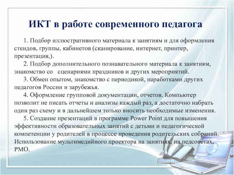 5. Создание презентаций в программе Рower Рoint для повышения эффективности образовательных занятий с детьми и педагогической компетенции у родителей в процессе проведения родительских собраний. Использование мультимедийного проектора на занятиях, на педсоветах, РМО.
