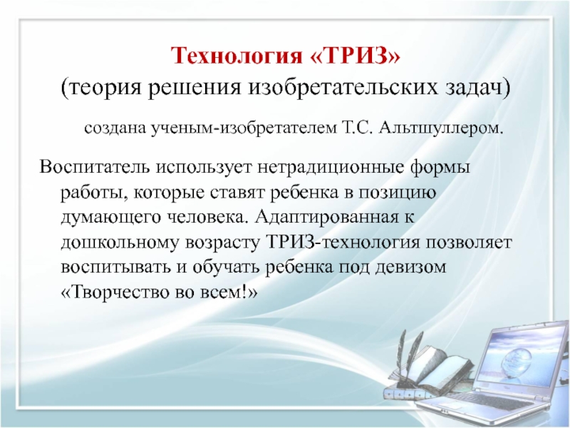 использует нетрадиционные формы работы, которые ставят ребенка в позицию думающего человека. Адаптированная к дошкольному возрасту ТРИЗ-технология позволяет воспитывать и обучать ребенка под девизом «Творчество во всем!»