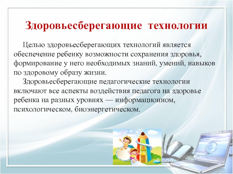 Здоровьесберегающие педагогические технологии включают все аспекты воздействия педагога на здоровье ребенка на разных уровнях — информационном, психологическом, биоэнергетическом.