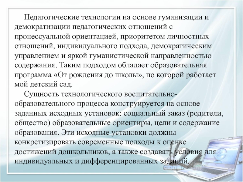 ориентацией, приоритетом личностных отношений, индивидуального подхода, демократическим управлением и яркой гуманистической направленностью содержания. Таким подходом обладает образовательная программа «От рождения до школы», по которой работает мой детский сад.