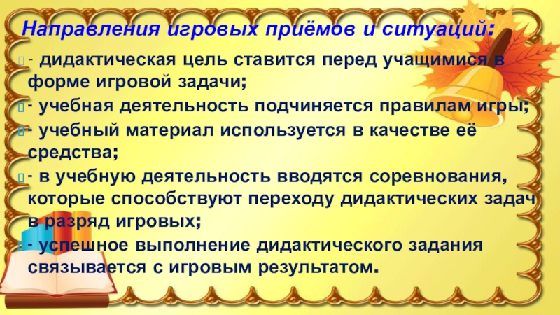 - учебная деятельность подчиняется правилам игры;