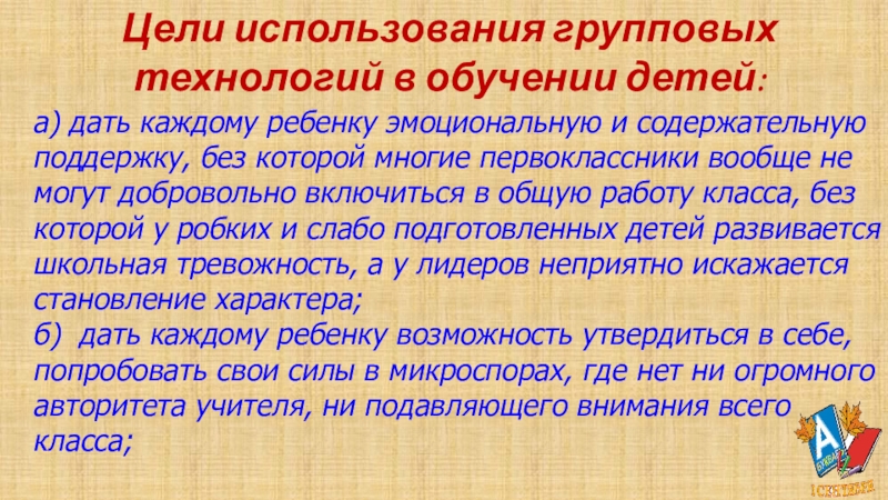 Слайд 18Цели использования групповых технологий в обучении детей:
