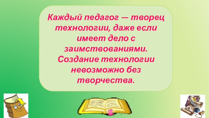 Слайд 29Каждый педагог — творец технологии, даже если имеет дело с заимствованиями.