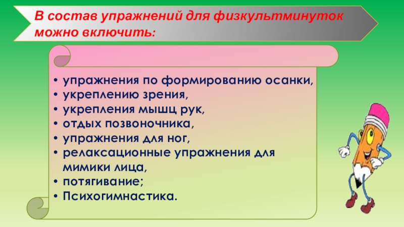 Слайд 27В состав упражнений для физкультминуток можно включить:
