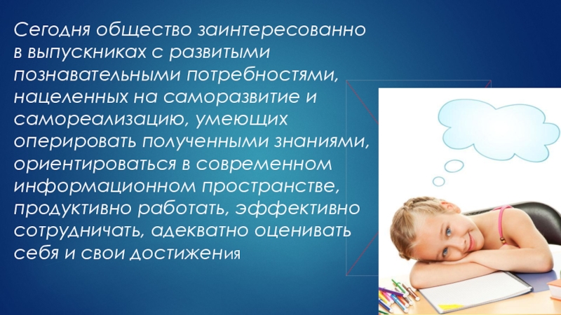 Слайд 3Сегодня общество заинтересованно в выпускниках с развитыми познавательными потребностями, нацеленных на