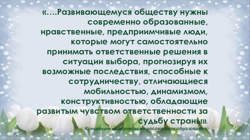 Слайд 2«….Развивающемуся обществу нужны современно образованные, нравственные, предприимчивые люди, которые могут самостоятельно