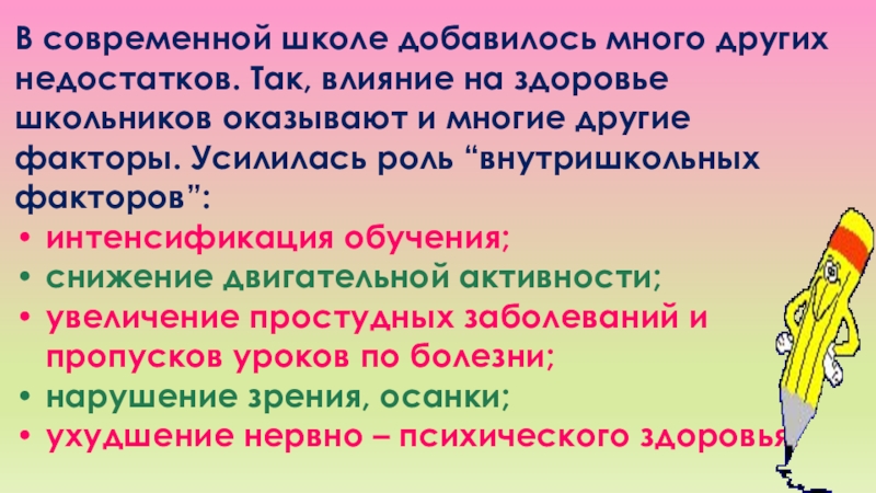 Слайд 24В современной школе добавилось много других недостатков. Так, влияние на здоровье
