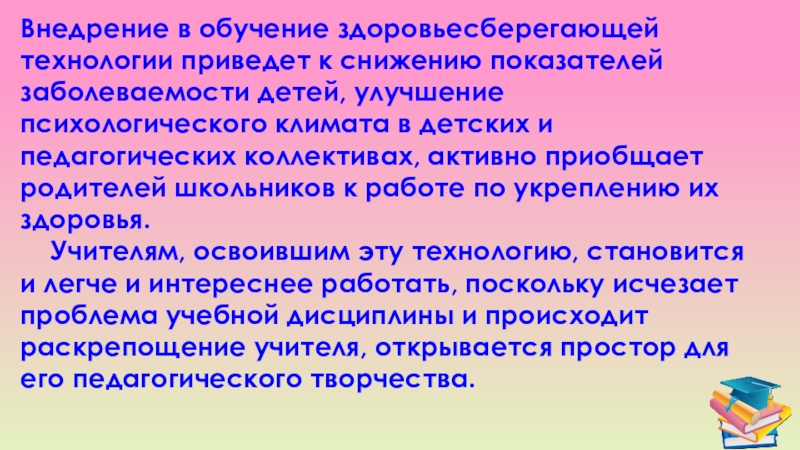 Слайд 28Внедрение в обучение здоровьесберегающей технологии приведет к снижению показателей заболеваемости детей,