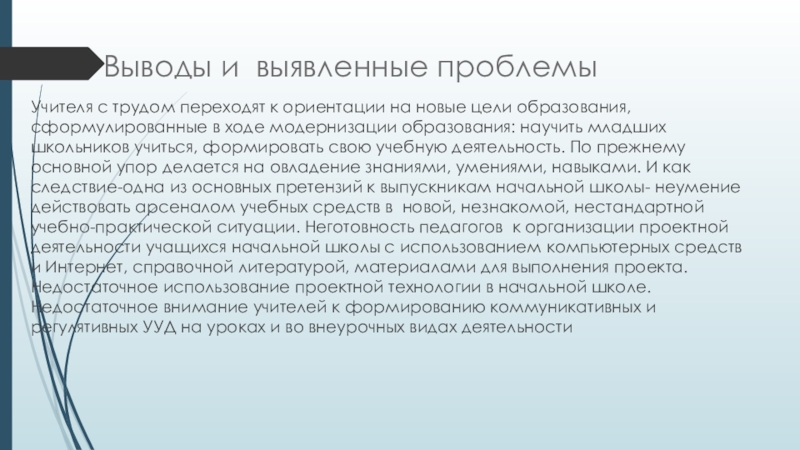 цели образования, сформулированные в ходе модернизации образования: научить младших школьников учиться, формировать свою учебную деятельность. По прежнему основной упор делается на овладение знаниями, умениями, навыками. И как следствие-одна из основных претензий к выпускникам начальной школы- неумение действовать арсеналом учебных средств в новой, незнакомой, нестандартной учебно-практической ситуации. Неготовность педагогов к организации проектной деятельности учащихся начальной школы с использованием компьютерных средств и Интернет, справочной литературой, материалами для выполнения проекта. Недостаточное использование проектной технологии в начальной школе. Недостаточное внимание учителей к формированию коммуникативных и регулятивных УУД на уроках и во внеурочных видах деятельности